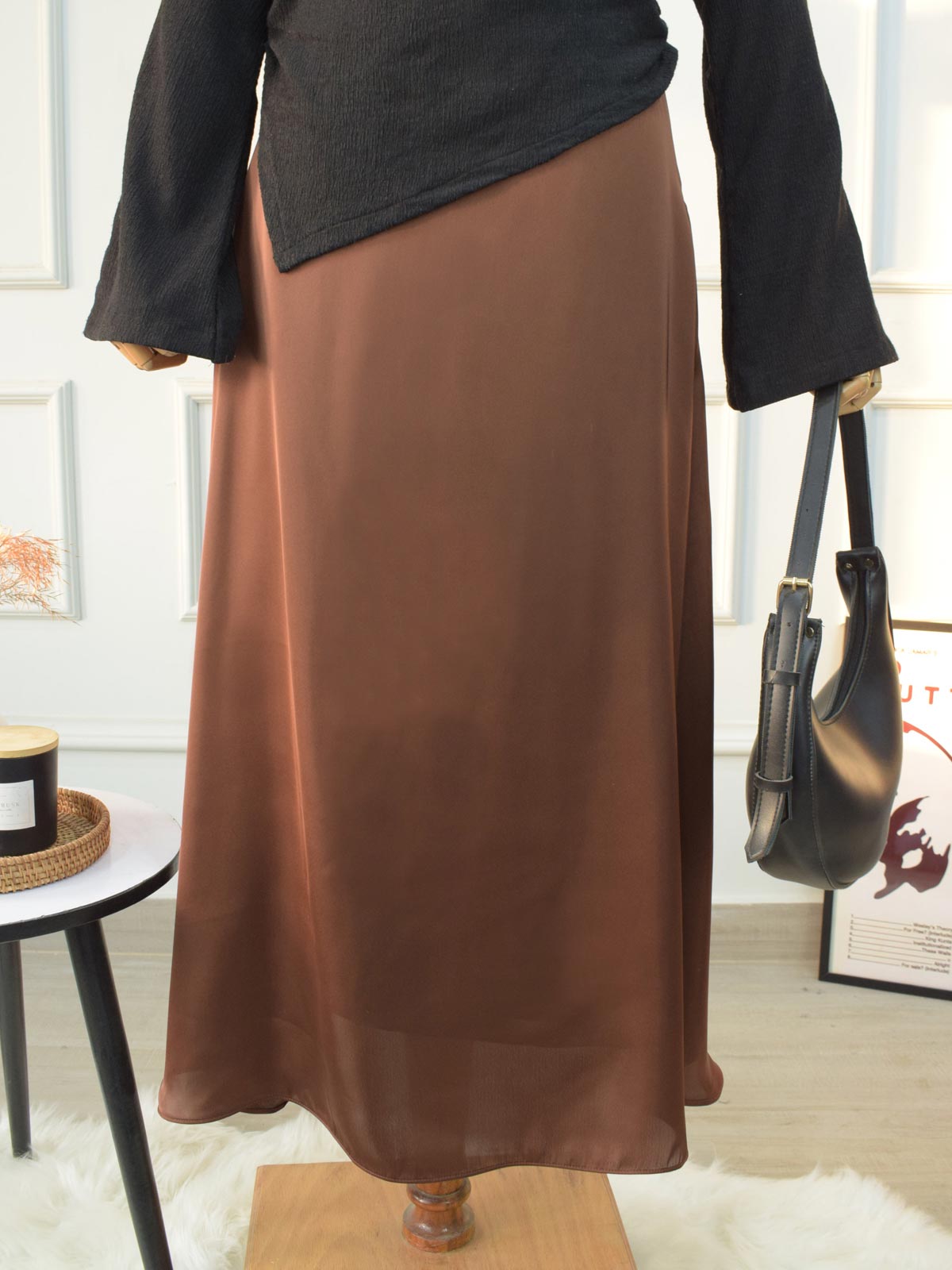 Design details: Minimalist brown silk skirt with a smooth, elegant drape and subtle sheen. Features a clean silhouette with a concealed side zip closure for a refined finish.