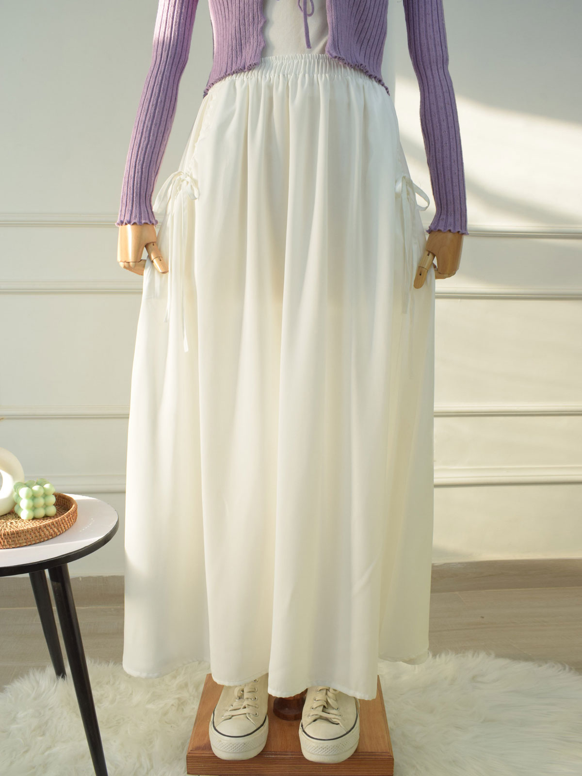 A versatile neutral skirt that pairs with any top-featuring side pockets with adjustable drawstrings you can tie into cute bows.