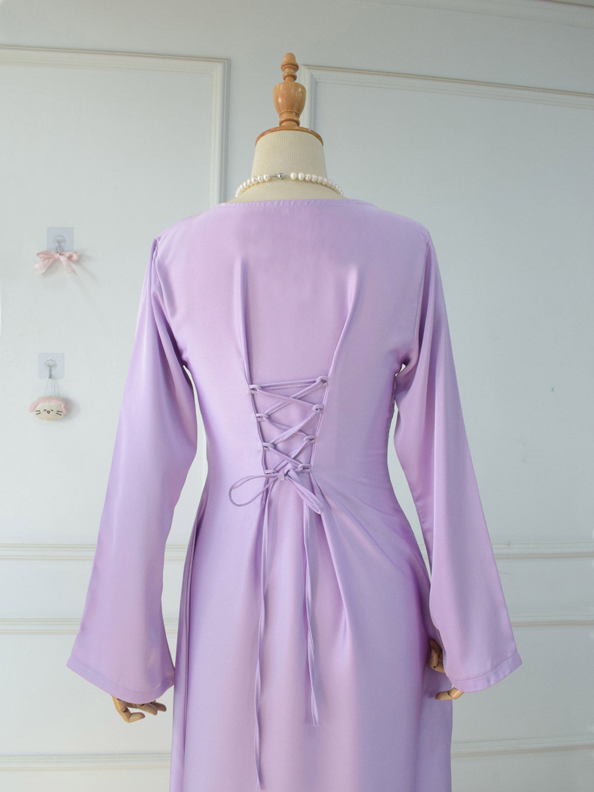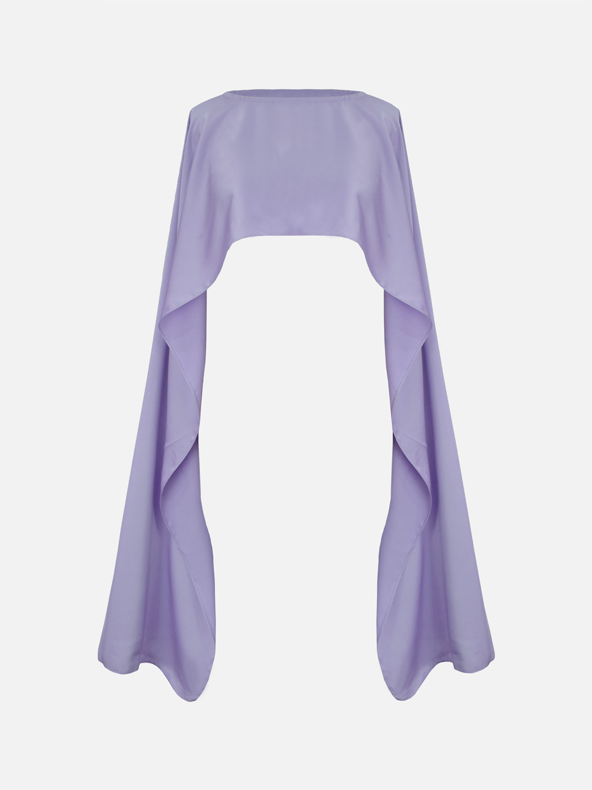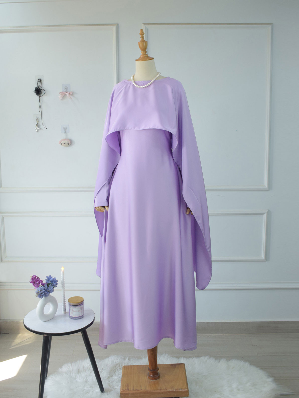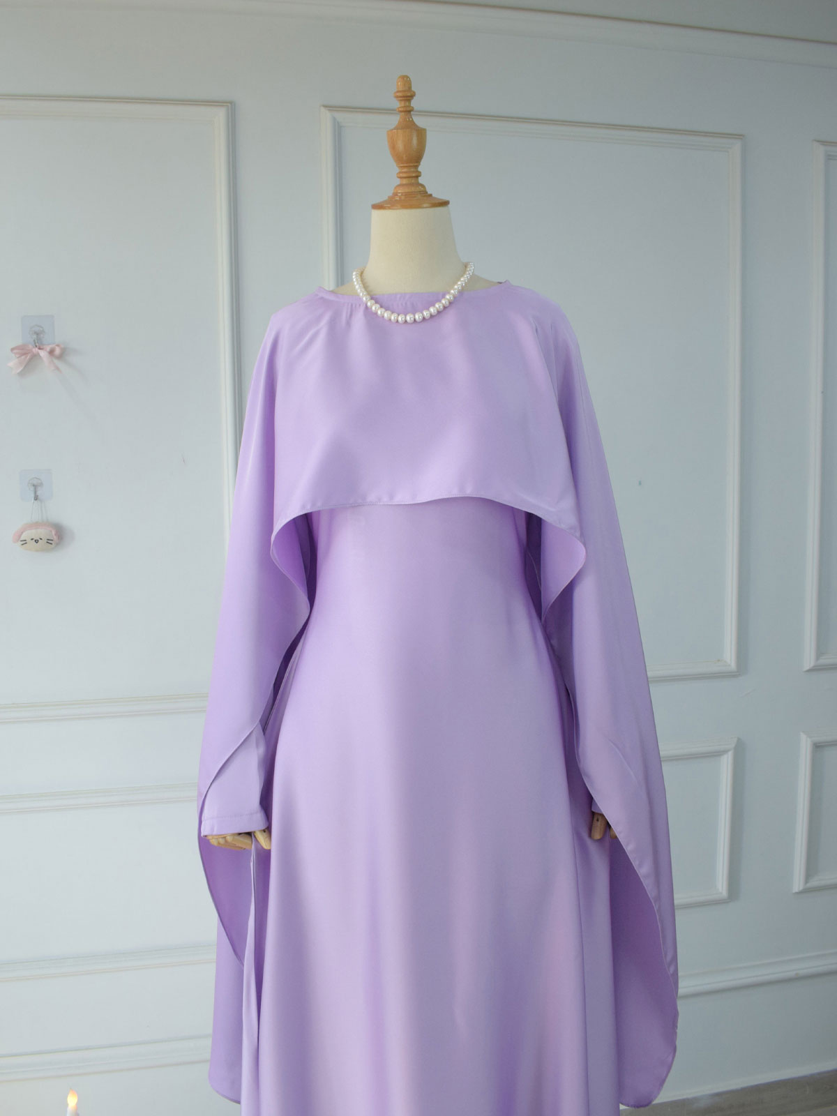 Design details: Long lilac silk dress with a boat neckline and wide flare. Features a corset-style lace-up back with loops for adjustable fitting. Paired with a separate flowing cape overlay that drapes from the shoulders.