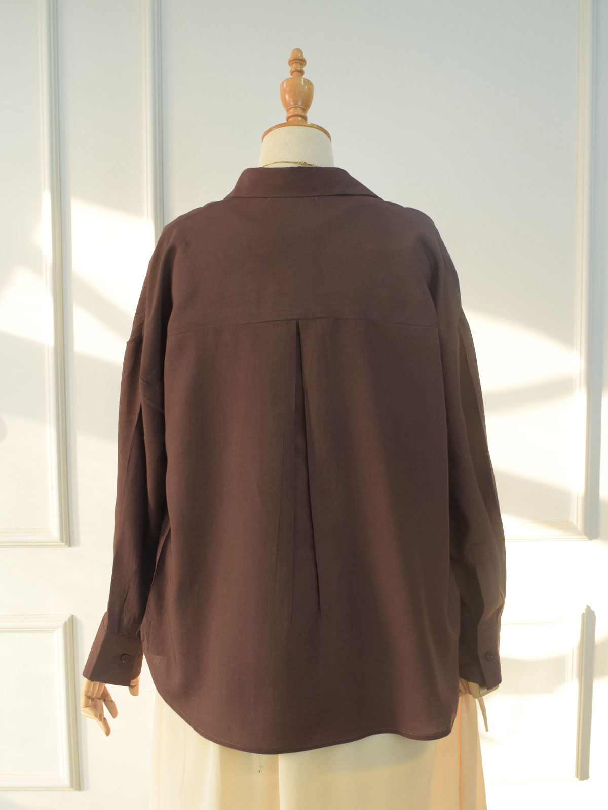 Design details: A minimal brown button-down shirt featuring a classic collar, full front button closure, and long sleeves finished with buttoned cuffs.
