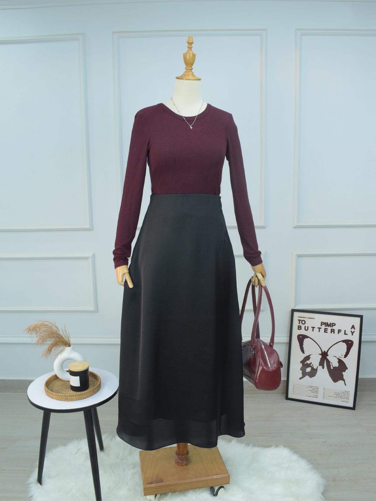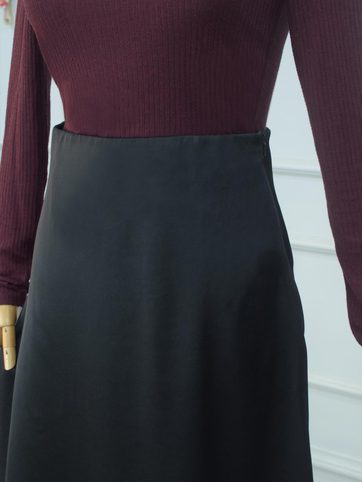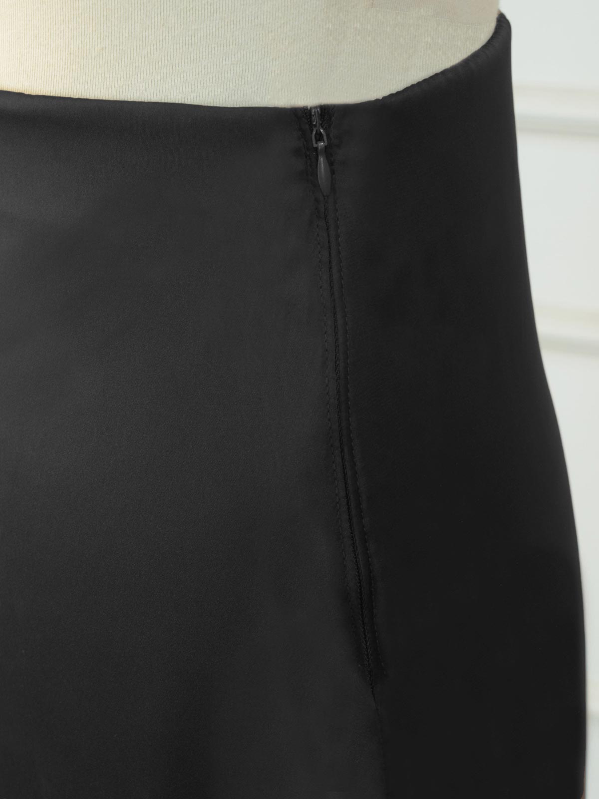 Design details: Minimalist brown silk skirt with a smooth, elegant drape and subtle sheen. Features a clean silhouette with a concealed side zip closure for a refined finish.