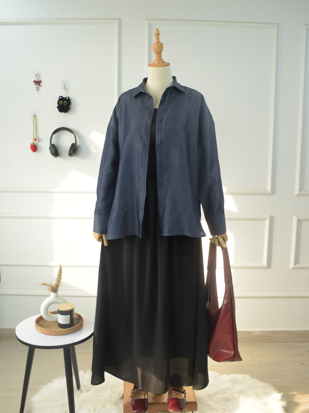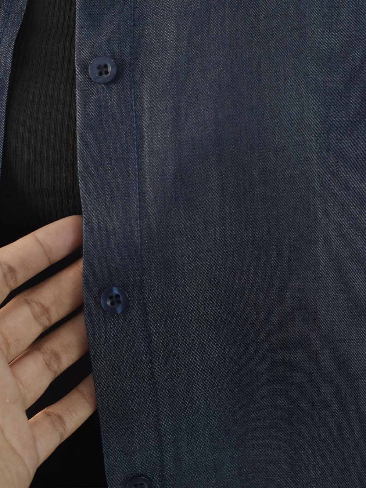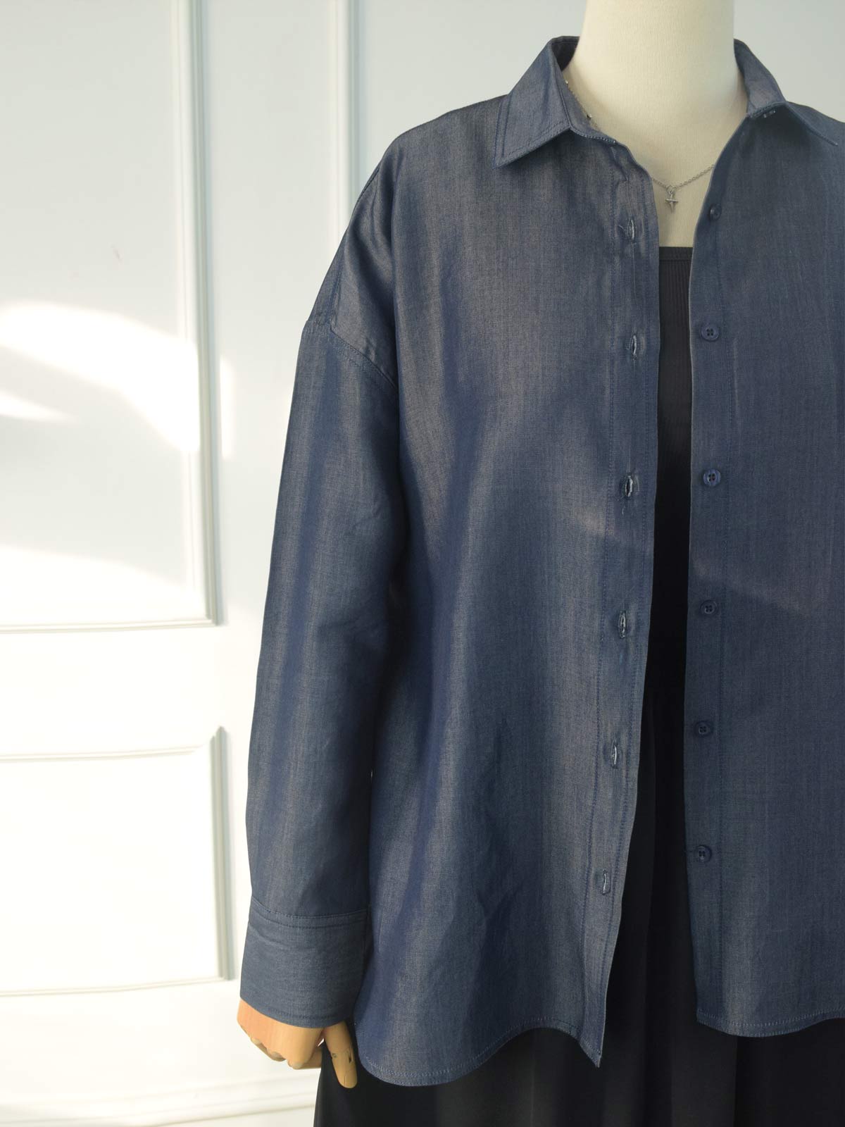 Design details: A soft denim button-down shirt featuring a classic collar, full front button closure, and long sleeves finished with buttoned cuffs.