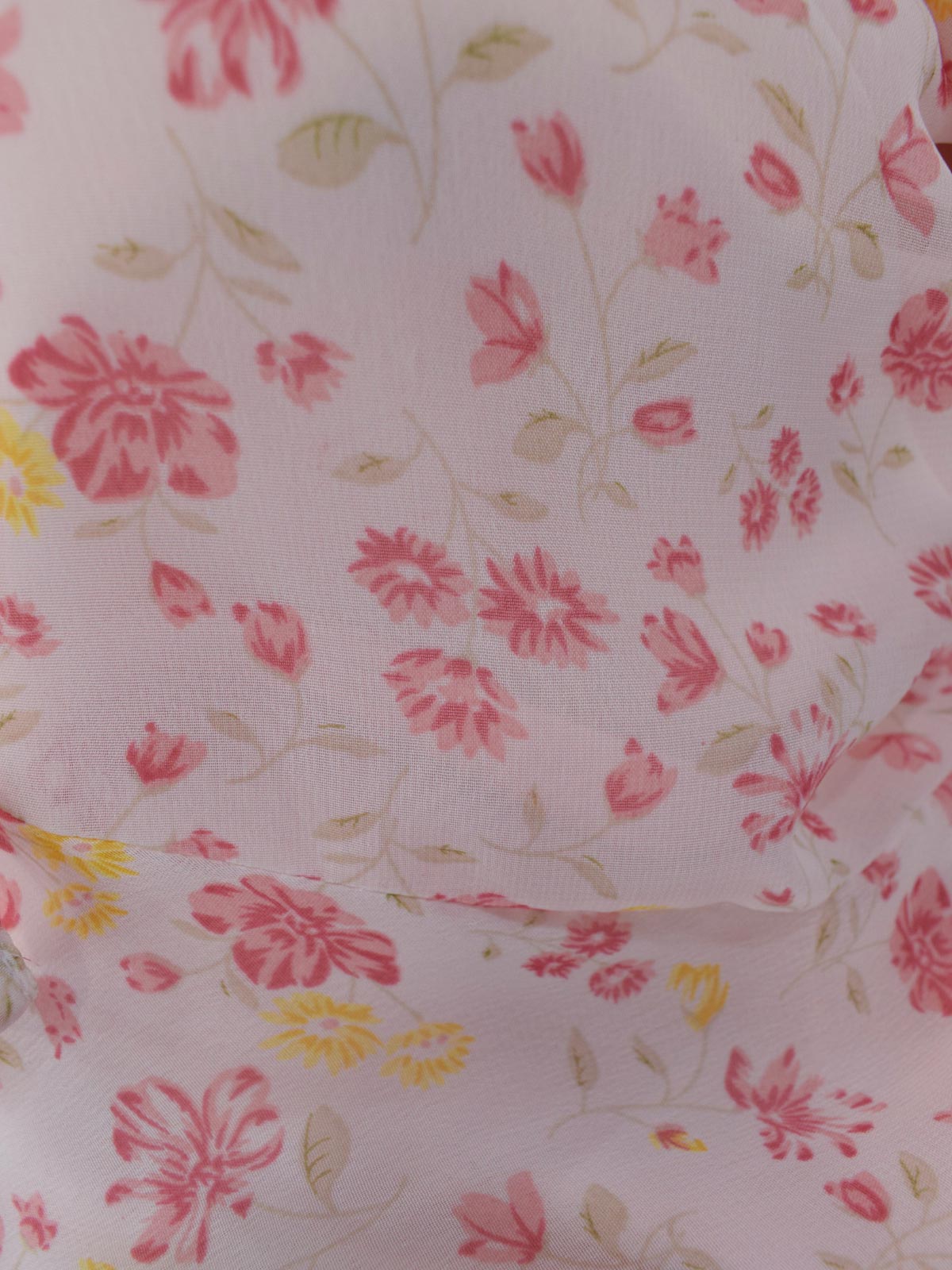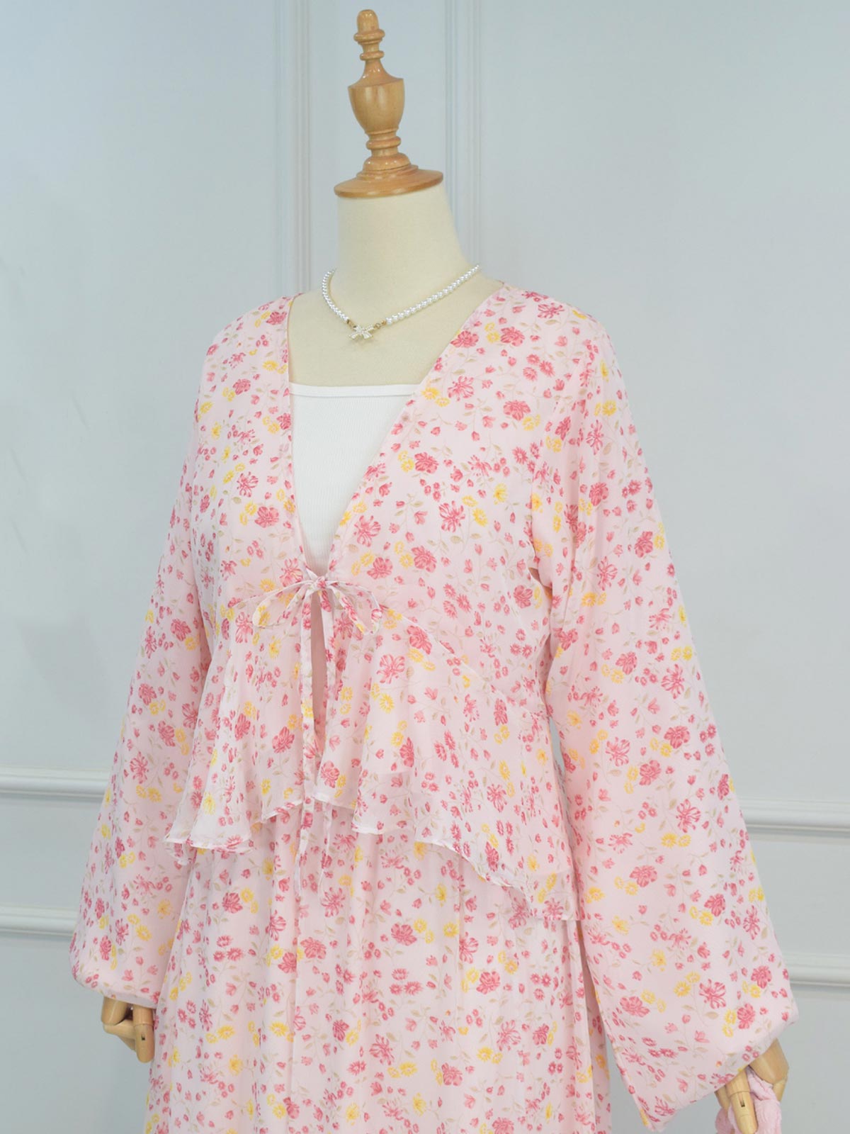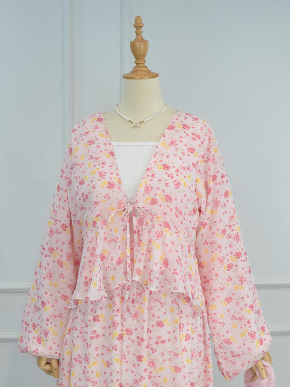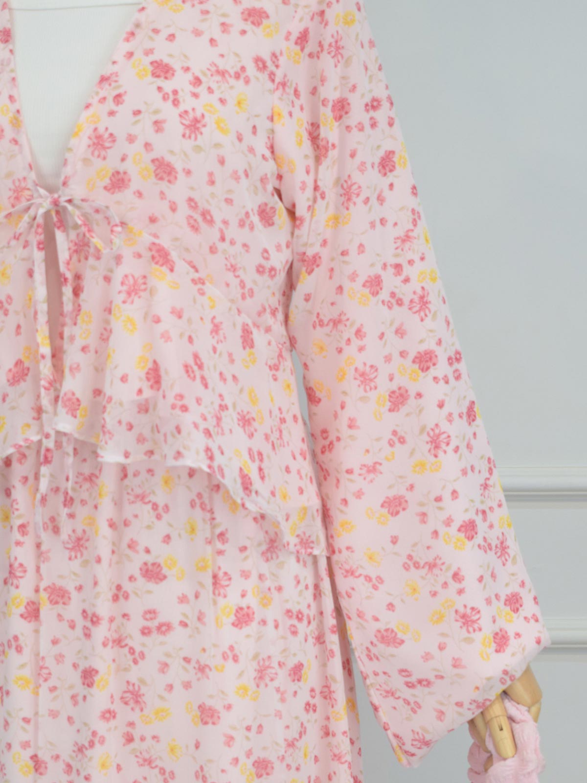 Design details: Korean-inspired front-tie design, wide sleeves, and a relaxed silhouette in a pink floral print. Peplum-style front detail for added flow.