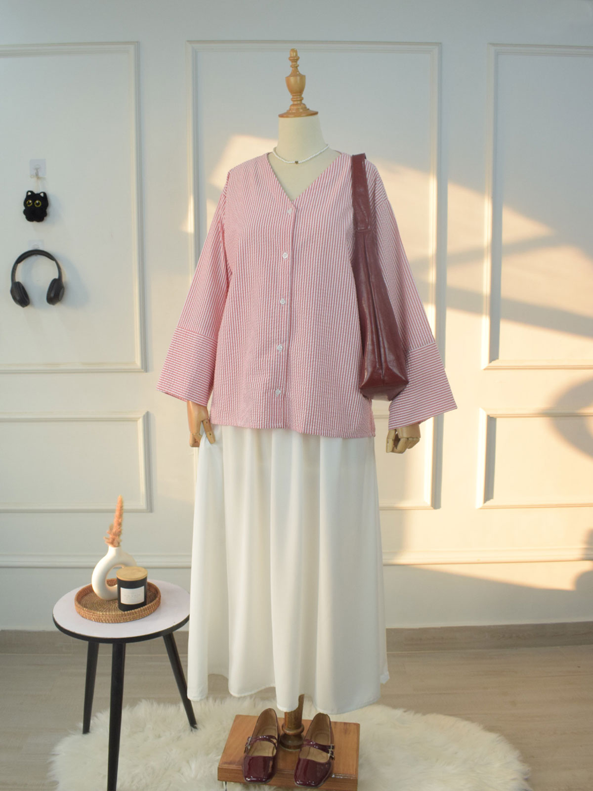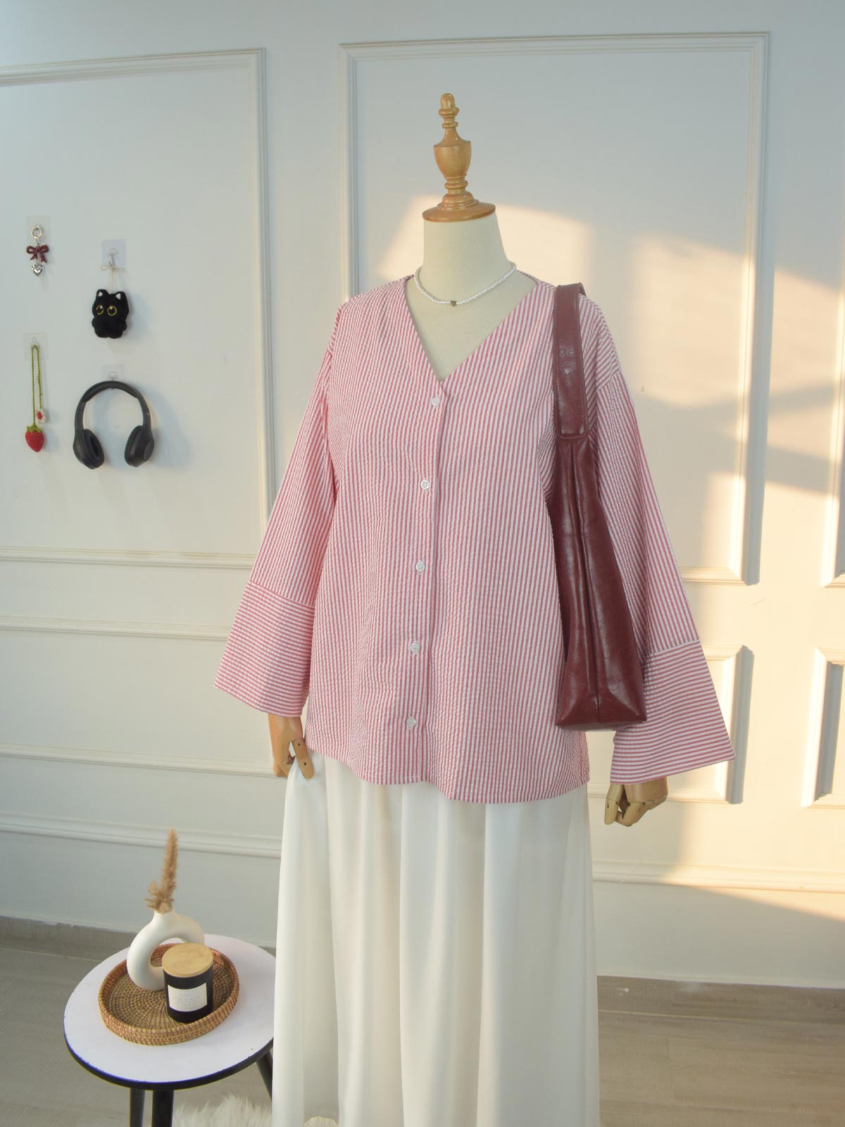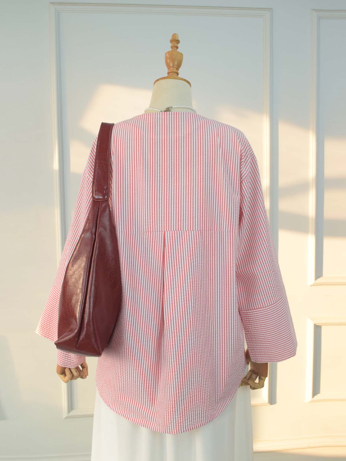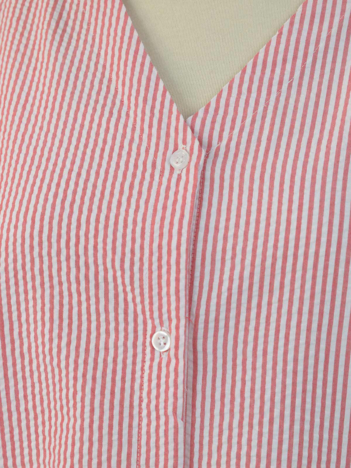 Design details: Soft V-neck top featuring delicate vertical stripes and a subtle textured finish. Designed with a front button-down closure and three-quarter sleeves with a clean cuff for a relaxed look.