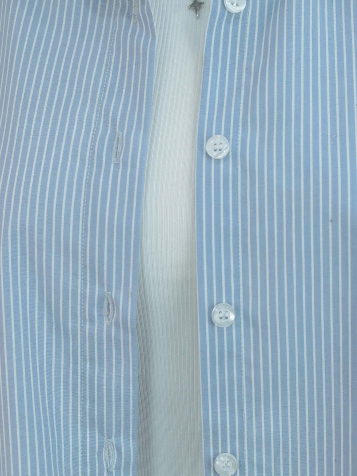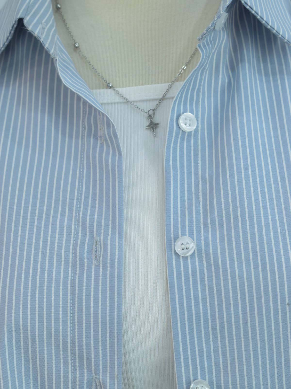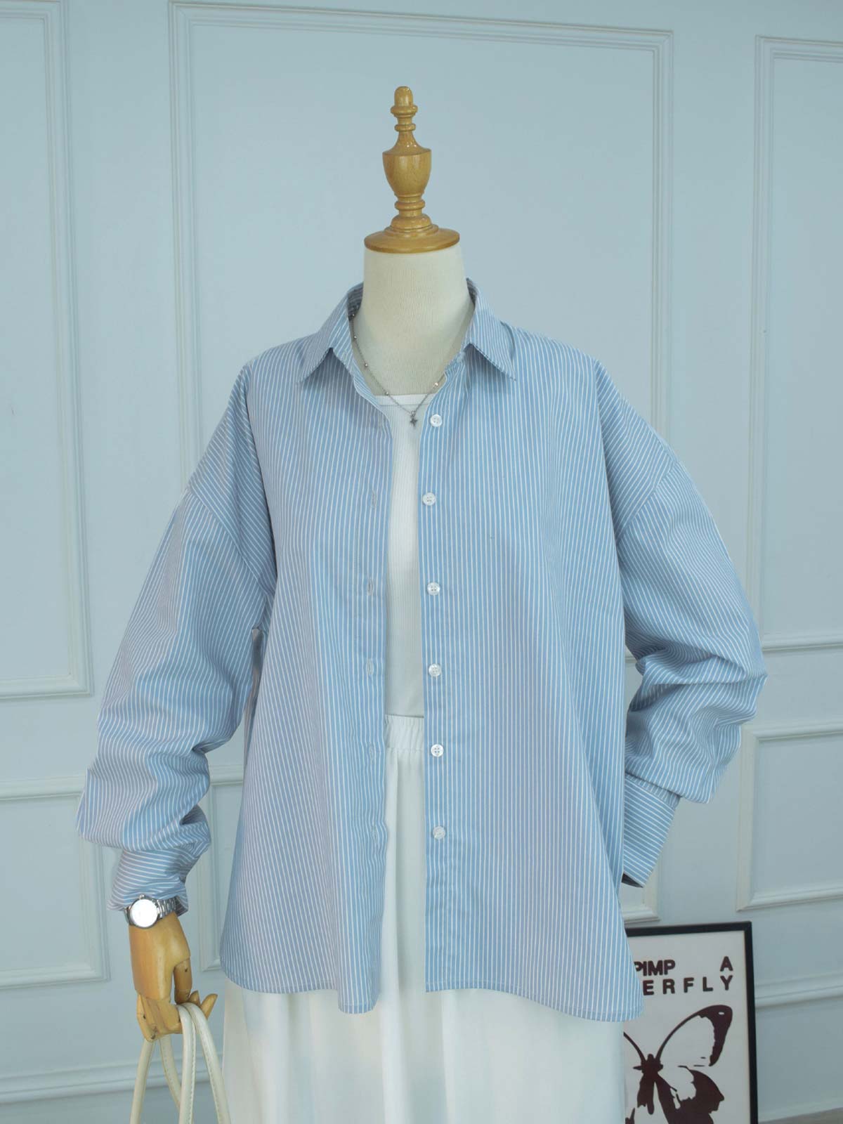 Design details: A relaxed blue striped button-down shirt featuring a soft collar, full button closure, and long sleeves finished with classic buttoned cuffs for a polished look.