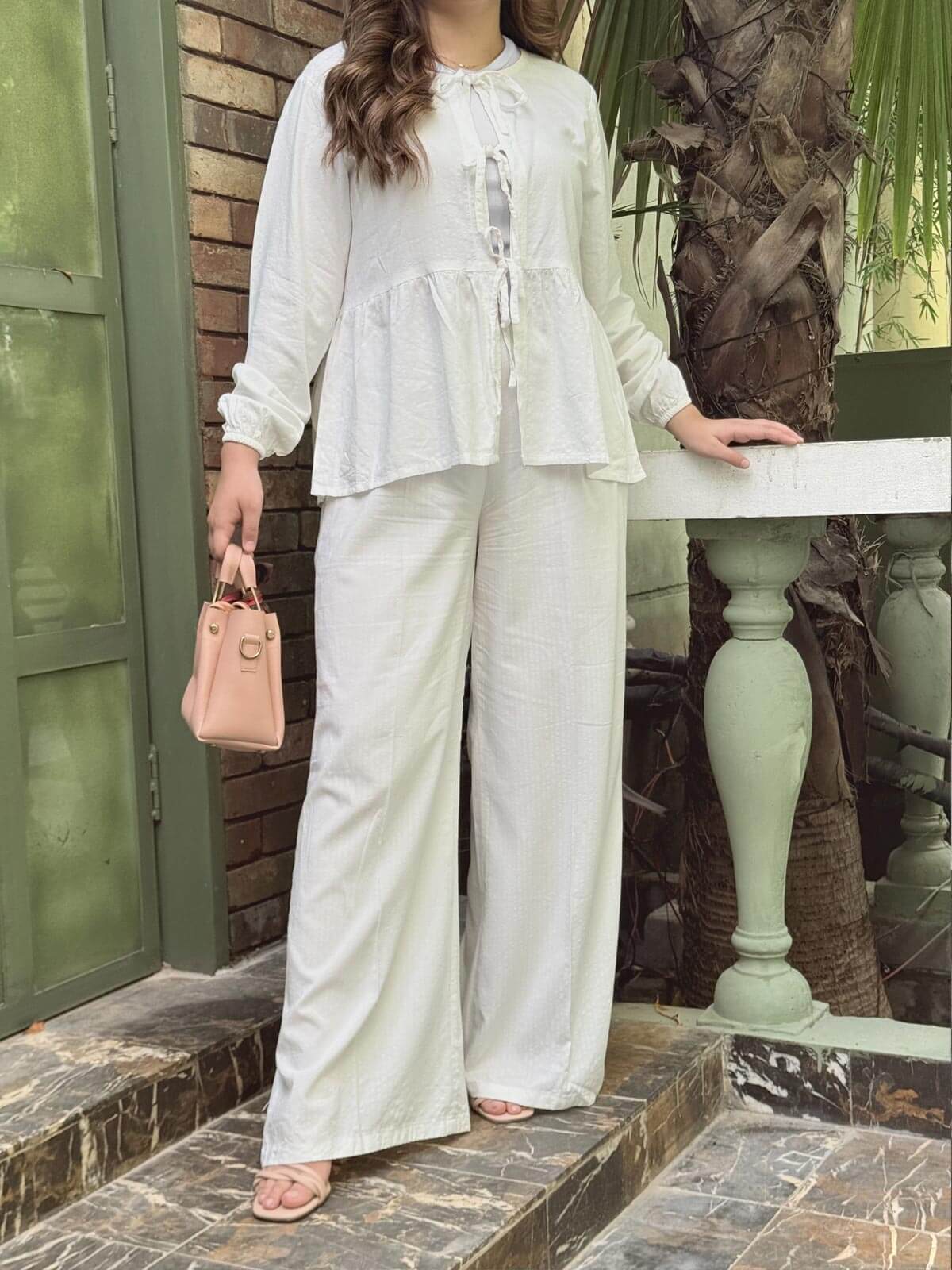 Design details: Korean-inspired white front-tie top featuring three bow closures, long elasticated sleeves, and a softly gathered waist for a flattering look. Made from lightweight textured fabric for premium feel.