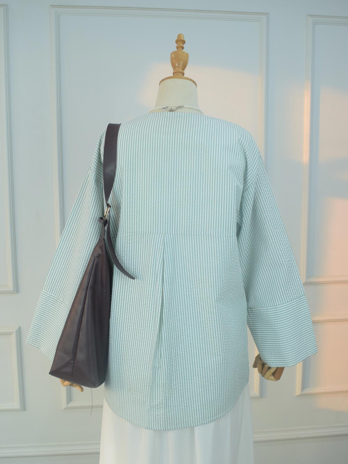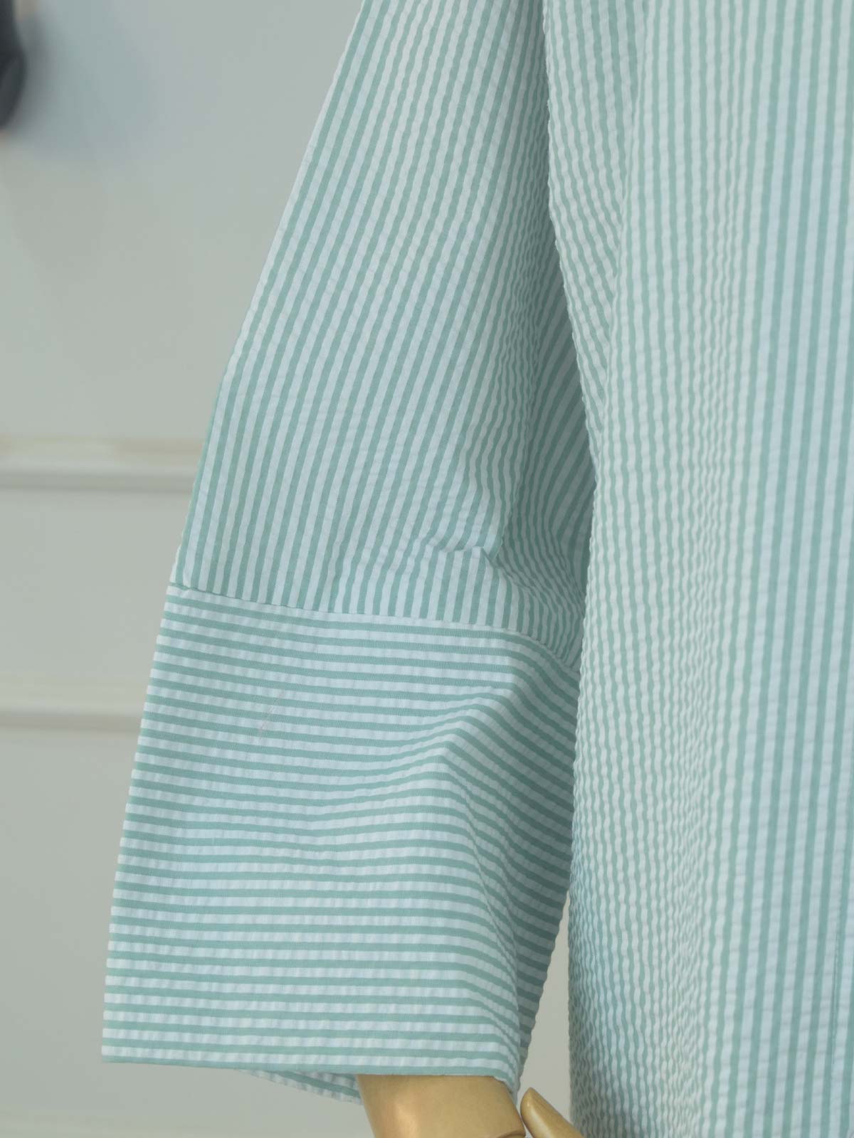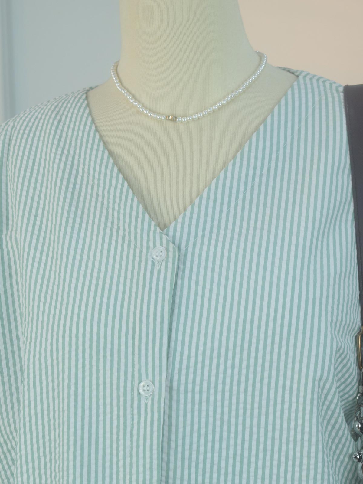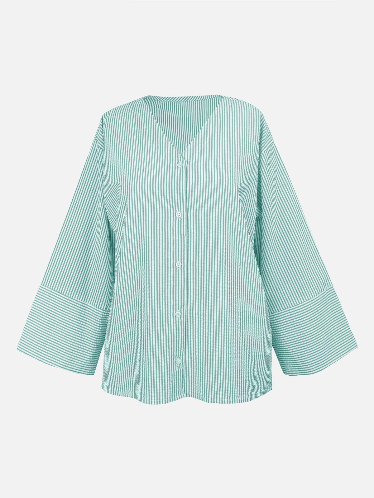 Design details: Soft V-neck top featuring delicate vertical stripes and a subtle textured finish. Designed with a front button-down closure and three-quarter sleeves with a clean cuff for a relaxed look.